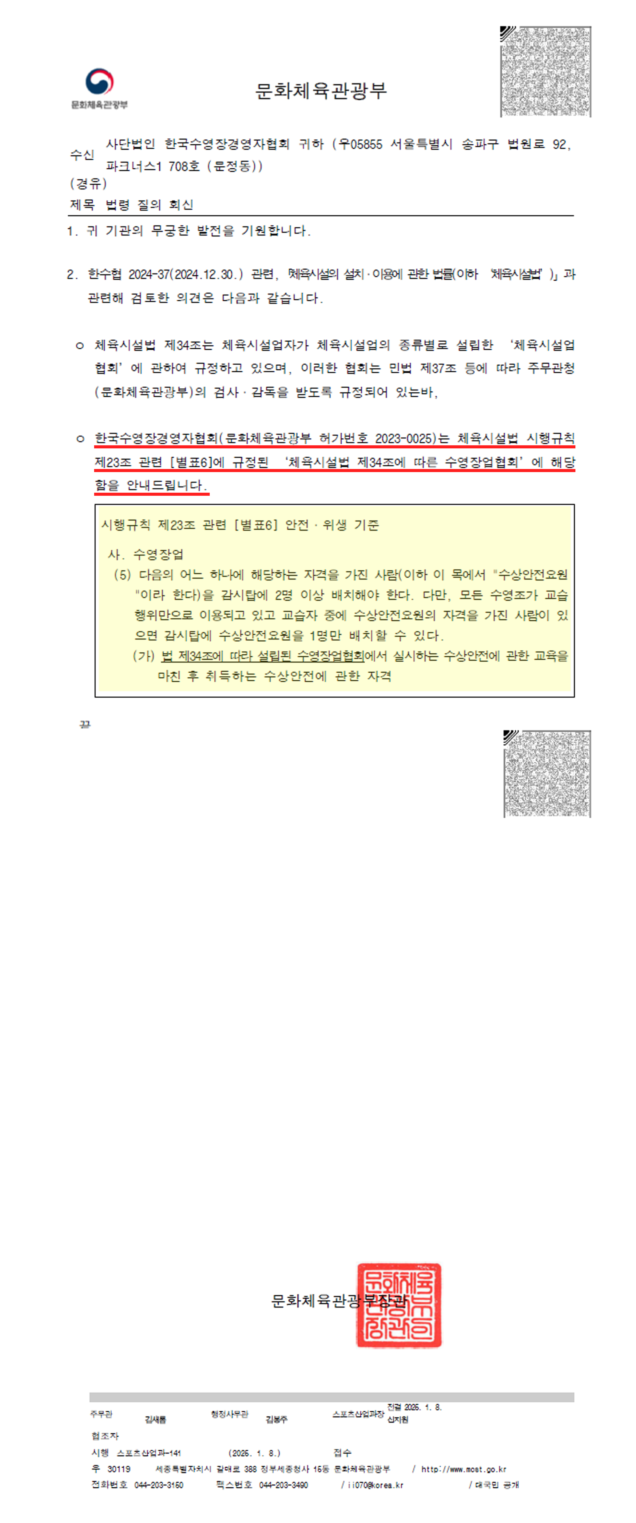 최고 수준의 교육 프로그램을 통해 수상 안전을 확보하고, 수영장 운영의 전문성을 높여 국민 건강 증진에 기여합니다.